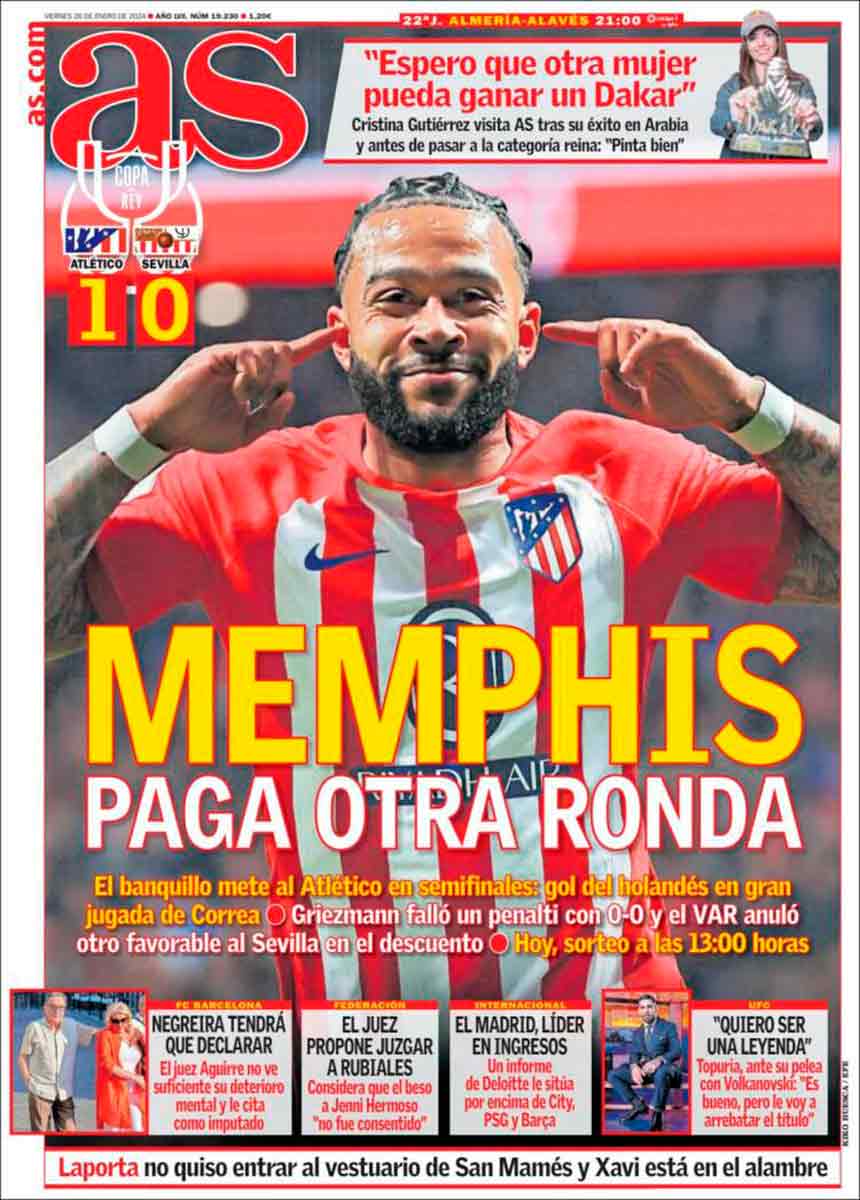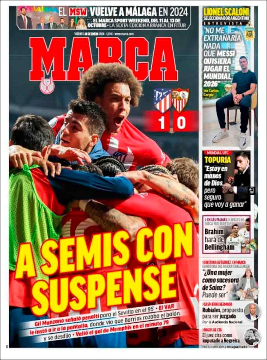 Sobre la jugada en cuestión, terminal y decisiva, informan las portadas de As y Marca de modo absolutamente aséptico, sin mojarse, no vaya a ser que se enfade Gil (Marín, no Manzano). Sin embargo, no dicen nada de una jugada más clara en el primer tiempo, cuando un defensa del Atleti derribó tontamente, pero indudablemente también, en área propia al jugador sevillista Sow, cosa de la que se quejaron amargamente los hispalenses. En ese mismo primer tiempo, Gil (Manzano, no Marín, aunque...) había señalado un penalti discutible a beneficio del cholismo, que Antoine Griezmann lanzó a las nubes por culpa de un resbalón. Pero pitado estaba, y dudoso era también. Todas, absolutamente todas las jugadas dudosas caen últimamente del lado colchonero, lo cual seguramente está bien, dada la cantidad de cosas que les debe el fútbol como equipo del pueblo que son.