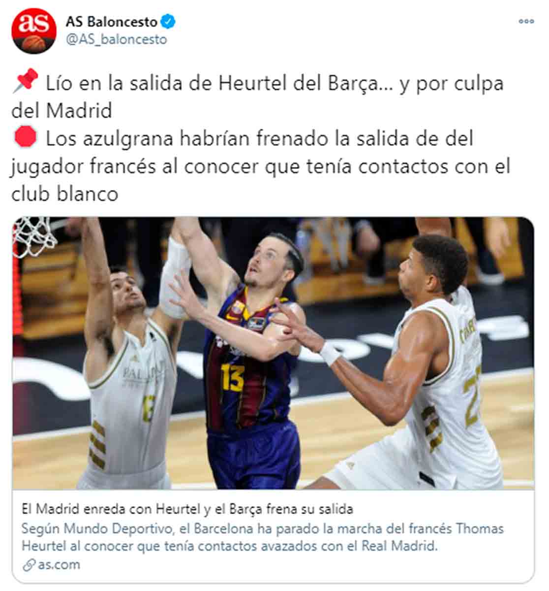 El tuit, o lo que sea, del As-co baloncesto, culpando al Madrid, "lío en la salida de Heurtel del Barça y ... por culpa del Madrid", nos confirma una vez más, el descarado apoyo de la Central Lechera al club de Concha Espina. ("Modo ironía on").