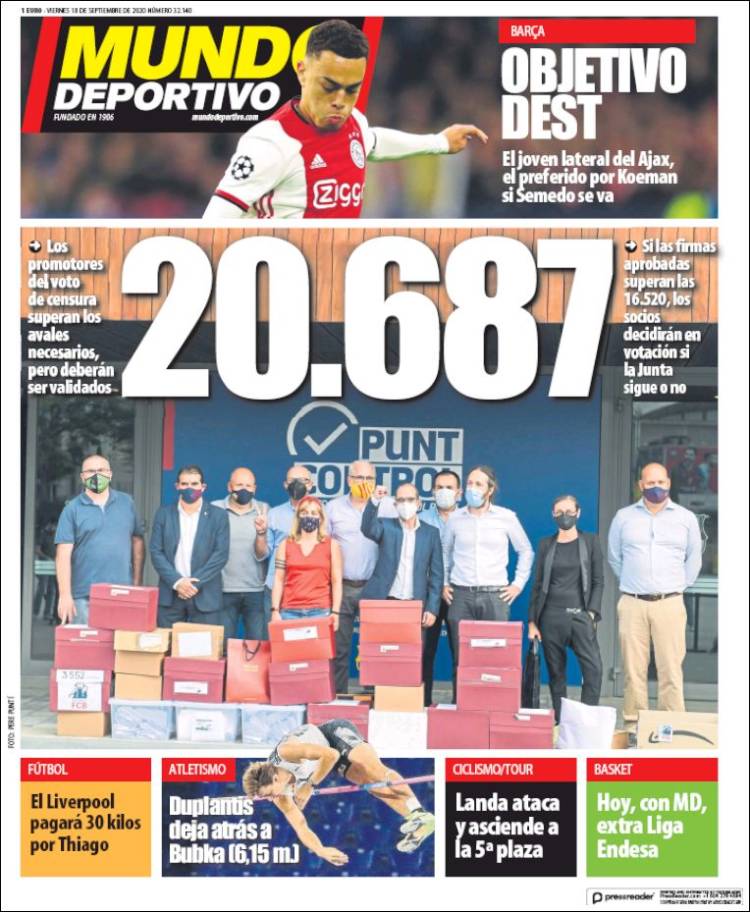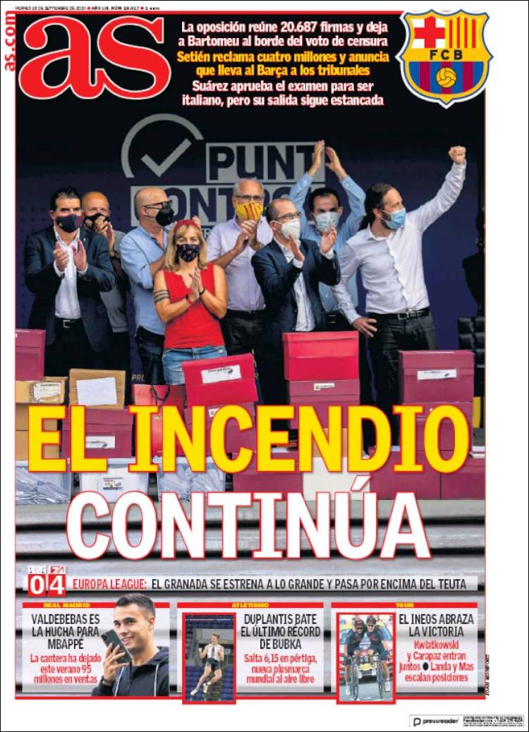 Buenos días. Os habrá tal vez extrañado el título del portanálisis de hoy. Tiene una explicación, como todo lo que sucede en La Galerna con la posible excepción de los artículos de Fred Gwynne. Lo vais a entender en cuanto os fijéis como Dios manda en la portada de As, que sobre el título “El incendio continúa” nos detalla que la oposición a Bartomeu en el Barça ha alcanzado la cifra de 20.687 firmas, suficientes para plantear al mandatario culé un voto de censura.