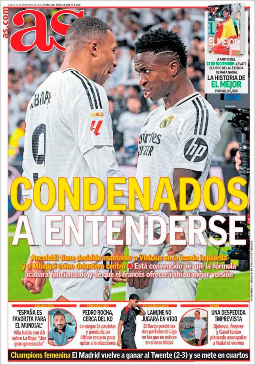 Según el periódico madrileño, Mbappé y Vinícius también están condenados, pero a entenderse, y así titulan. Añaden que Ancelotti tiene decidido mantener a Vini en la izquierda y a Kylian por el centro porque está convencido de que la fórmula acabará funcionando y Mbappé ofrecerá ahí su mejor versión.