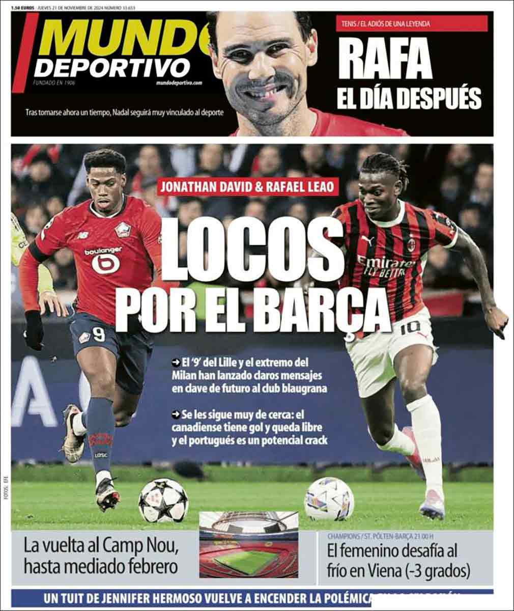 Os mostramos las primeras planas culés porque en esta sección lo hacemos. Una de las dos —hoy Mundo Deportivo— suele llevar futuribles para el club de Laporta, cuya labor en este segundo mandato se centra en la compraventa de jugadores junto al representante, perdón, director deportivo Deco.