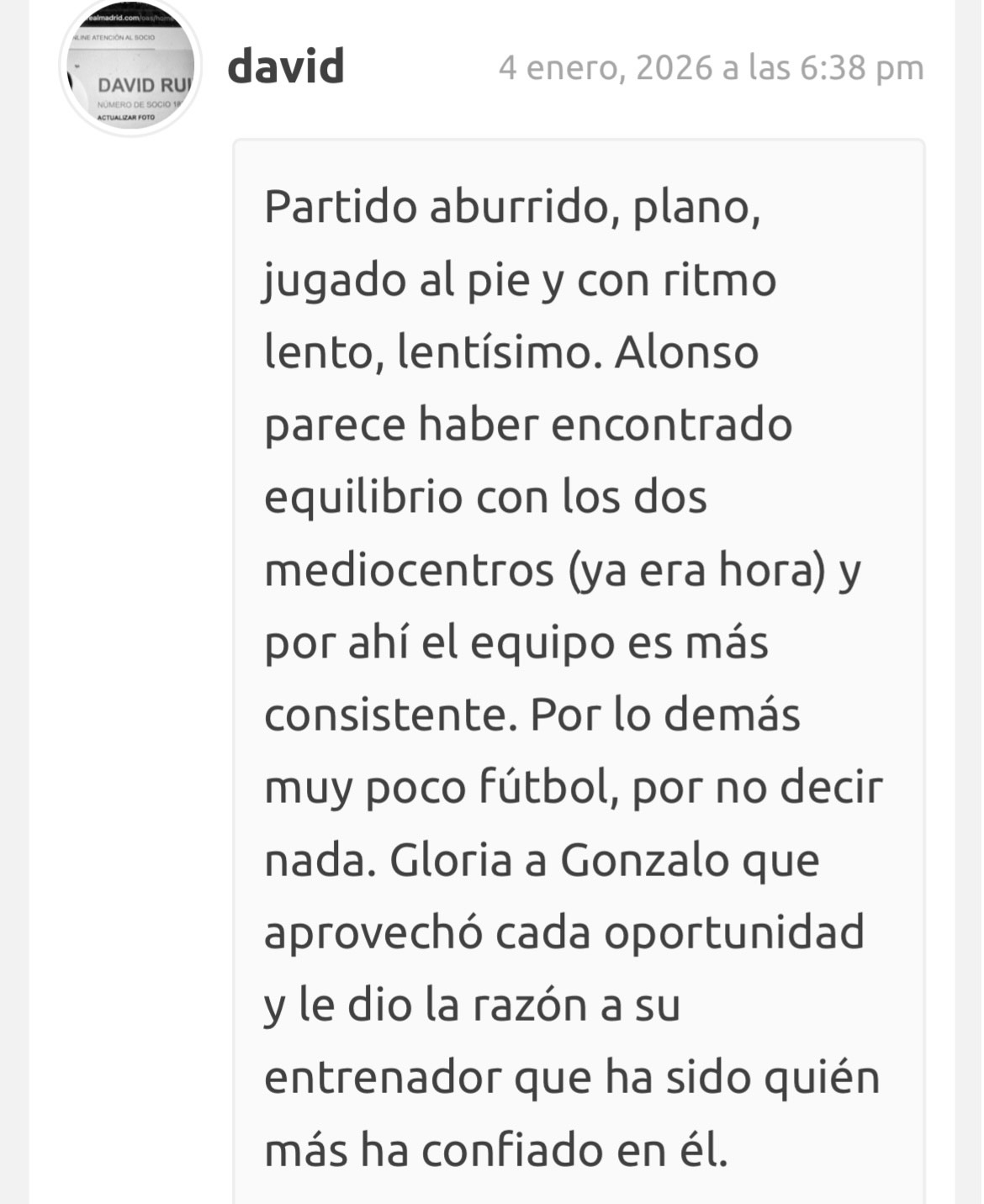 Por alusiones, repito que yo no pité en el estadio, pero esa gente es la misma que ovacionó a Gonzalo, la misma que eligió a Florentino Pérez cuando Lorenzo Sanz acababa de ganar dos copas de Europa y la misma que paga sus abonos desde hace 30 o 40 años, como es mi caso. Catalogarlas de "vinagres" o "piperos" me parece una falta de respeto. El ambiente en el estadio no era de fiesta a pesar de los 5 goles porque, reitero, el juego fue plano, lento y previsible. Si a vosotros os vale, perfecto, a mí no.