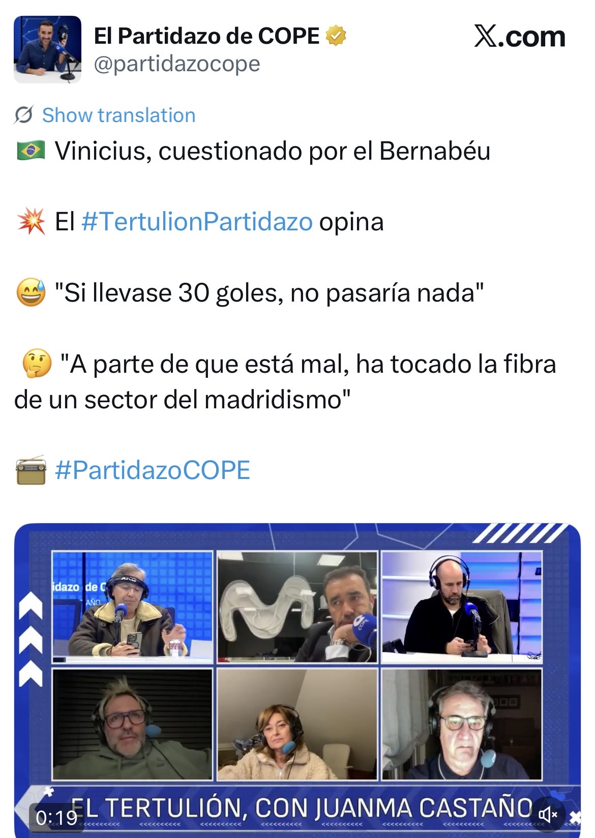 La agenda de la vergonzosa prensa deportiva que padecemos es independiente de qué tal juega el Madrid y de sus resultados. Una manita no sirve para aplacar su ansia de sangre. De hecho, con una manita de los de Xabi, ellos son muy capaces de estrangularte. Ellos están ahí para meter mierda, básicamente, como sabe cualquiera que no haya estado metido en una cueva los últimos 40 años, y más específicamente para meter mierda contra Vinícius, como sabe cualquiera que lleve un lustro prestando un mínimo de atención. Ved si no de qué hablaba la Cope, la insufrible Cope, al término de la goleada blanca.