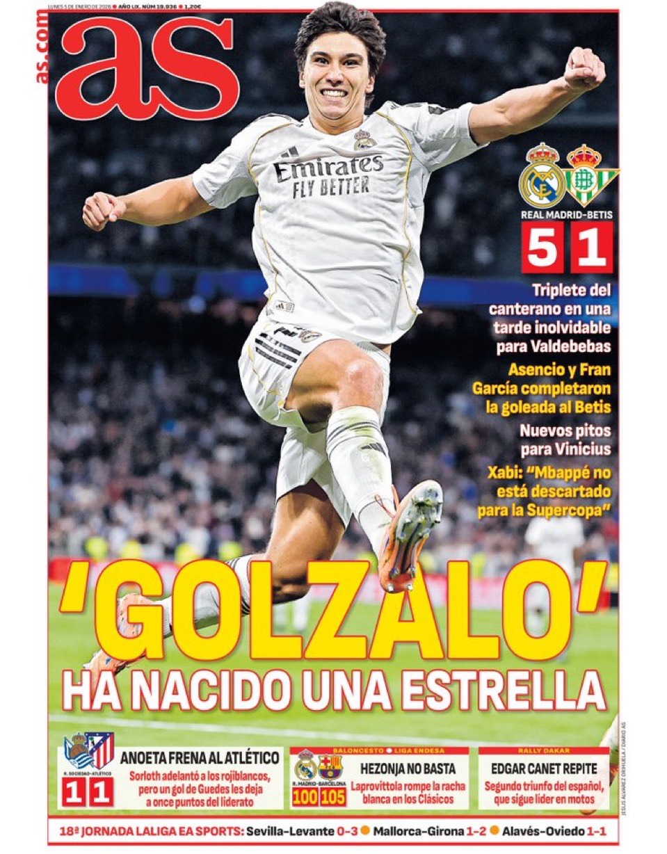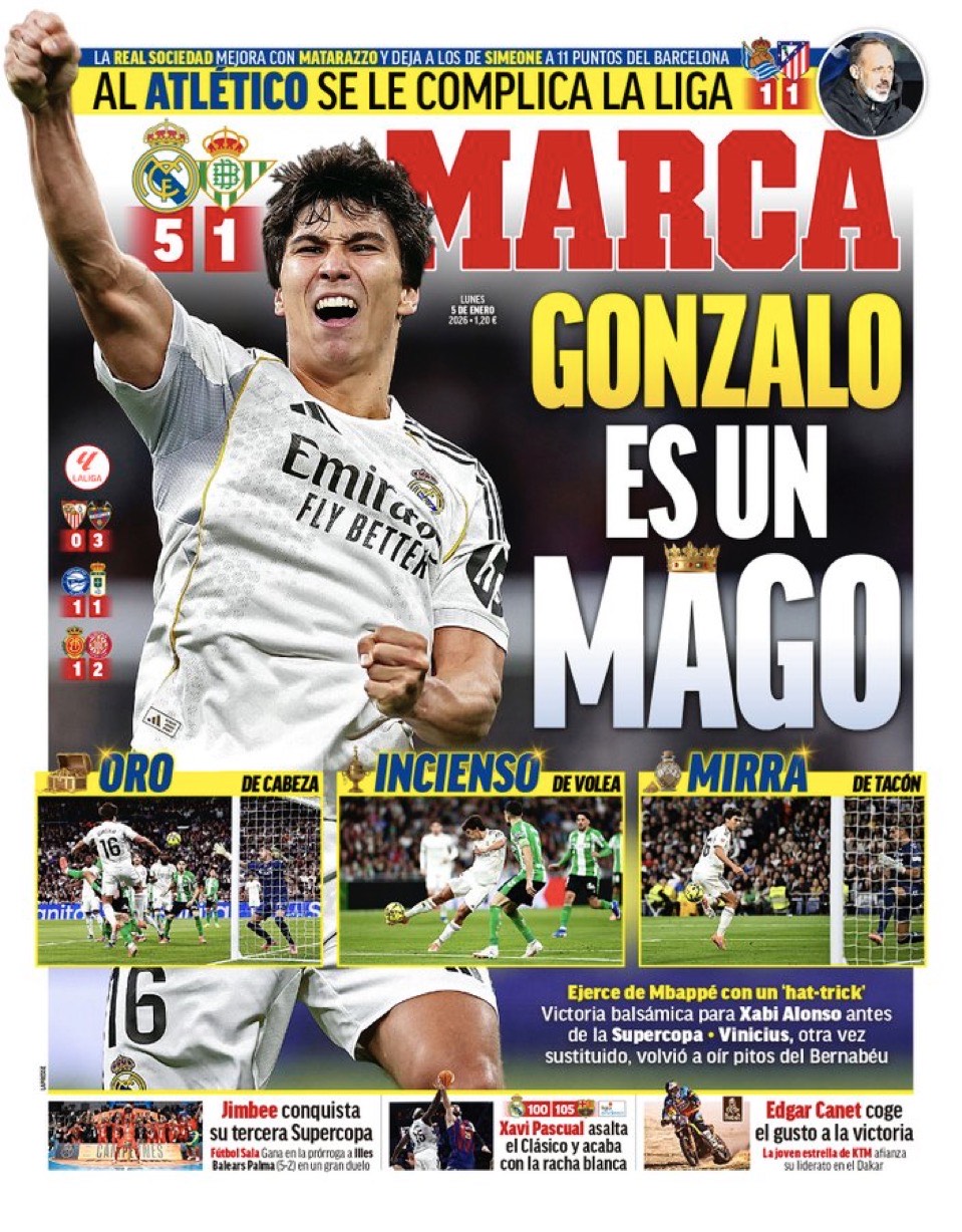 El delantero madrileño reverdeció los laureles de su pichichi en el Mundial de Clubes y recordó, de paso, una máxima ciertamente básica en el mundo del fútbol: con un nueve puro se vive mejor. Gonzalo es un nueve joven, pero no ajeno a los movimientos específicos de la posición y las calidades que el puesto requiere. Es una figura que con frecuencia se echa de menos en el equipo, al menos en su versión más prototípica. Fue su gran tarde, y puede ser un punto de inflexión en su carrera. La portada marquista lo convierte en rey mago (oh, qué derroche de ingenio, ¿será por ventura porque esta noche es la gran noche de Sus Majestades de Oriente?) y torna también en oro, incienso y mirra metafóricos sus tres golazos, fruto cada uno de una suerte distinta del fútbol.