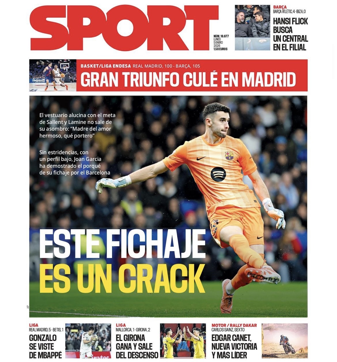 En fin. El recuerdo de esta homérica cagada en forma de portada cataculé nos parece una buena excusa para dejaros con las primeras planas representantes de dicho cataculerío en el día de hoy. El Madrid de los canastos perdió contra el Barcelona. Scariolo no está, de momento, sacando todo el jugo posible a la gran plantilla que se le ha encomendado.