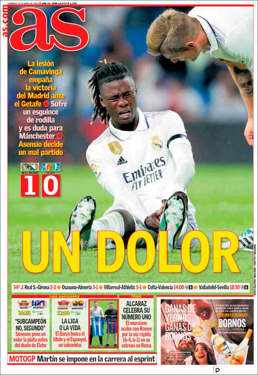 As titula “Un dolor” sobre la imagen de Camavinga que agarra afligido su rodilla mientras Kroos se interesa por su estado. En la portada no hay mención alguna a que el autor de la entrada miserable fue Juan Iglesias ni a que no tuvo la correspondiente sanción.