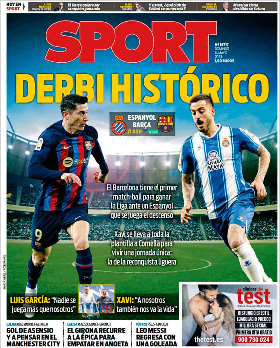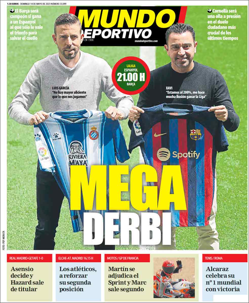 En Mundo Deportivo, posan los entrenadores, Xavi con actitud de tender la ropa y Luis García de coger por los cuernos una motocicleta, entendemos que una “Mega derbi”.