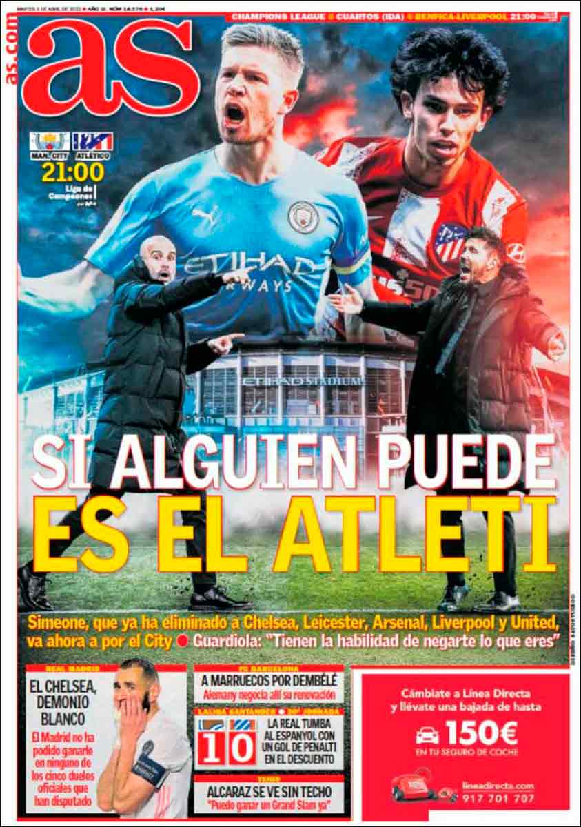 Buenos días. En 1967, Lennon cantaba en su psicodélica I am the walrus que estaba sitting in an english garden waiting for the sun; hoy, 5 de abril de 2022, el Madrid también está sitting in an english garden, pero waiting for the match, esperando el partido, el del Chelsea, por supuesto, donde se juega la mitad de su pase a semifinales de Champions. Pero para llegar al esperado encuentro tenemos que atravesar el vía crucis de soportar un enfrentamiento entre Guardiola y Simeone, que es como asistir en directo a una cena de Nochevieja entre tu cuñado y tu suegra sin que te permitan beber para superar el trago del momento. Aunque no podemos negar que futbolísticamente hablando es un choque interesante y, como tal, los periódicos madrileños le dedican sus portadas. Imaginamos a los panenkitas impacientes, sacando punta a sus lapiceros para llenar las pantallas de sus iPad de flechitas de colores y sus TL de palabras indescifrables, mezcladas con exacerbadas loas a los esquemas cytiatléticos.