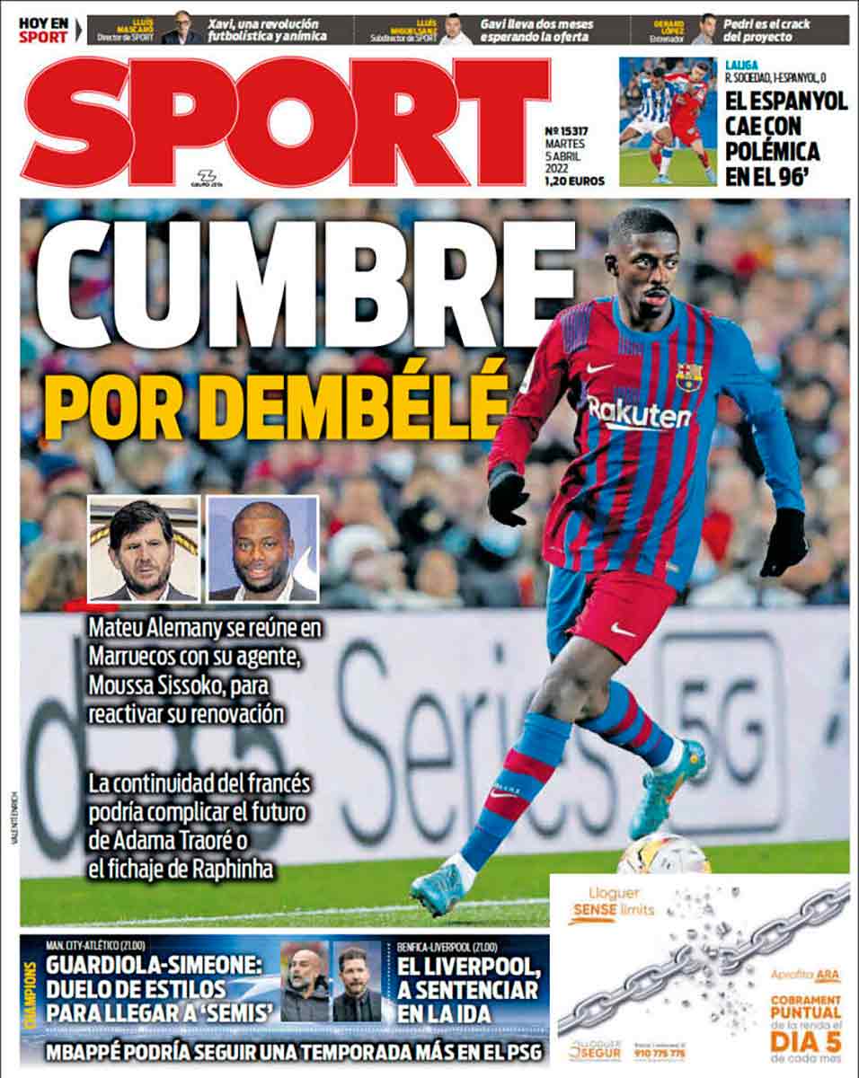 Aprovechando que libran en Champions por estar eliminados prematuramente, como suele ser habitual en los últimos años, los diarios catalanes se centran en cosas suyas, asuntos de cumbres, pero no borrascosas, sino marroquíes. ¿Se refieren a la cordillera del Atlas? No, se refieren a una cumbre entre Mateu Alemany y Moussa Sissoko —a la sazón representante de Ousmane— en el país africano para tratar la renovación de Dembélé. Lo dicho, sus cosas.