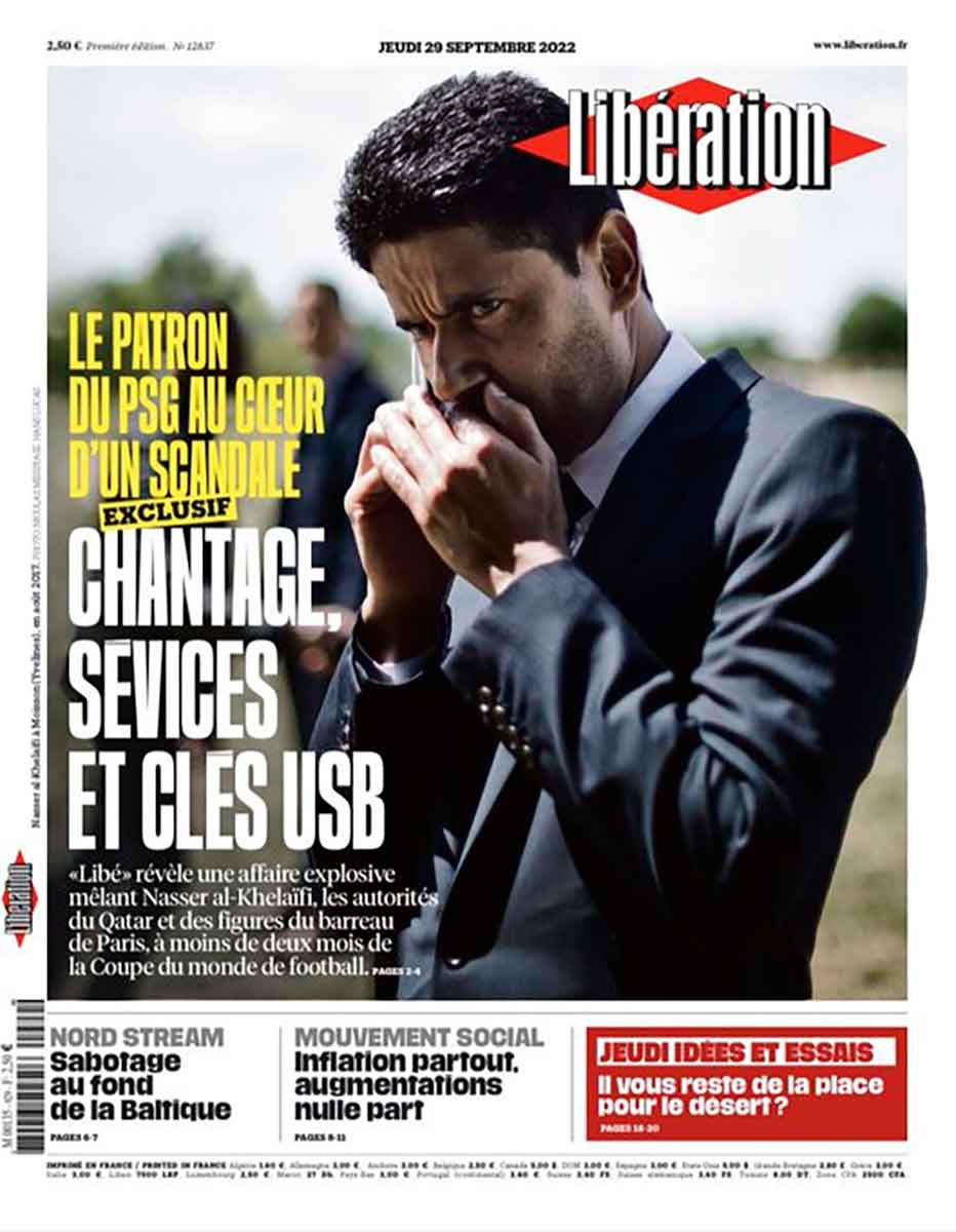 Buenos días. Hoy nos vais a permitir que abramos el fuego no con una portada deportiva nacional , como tenemos por costumbre, sino con una primera plana foránea. Francesa, para ser exactos. La del diario Libération, que en un trabajo de investigación de los que ya casi no se hacen ha descubierto el pastel de una trama no ya turbia, sino renegrida de miseria, al frente de la cual estaría Nasser Al-Khelaifi.