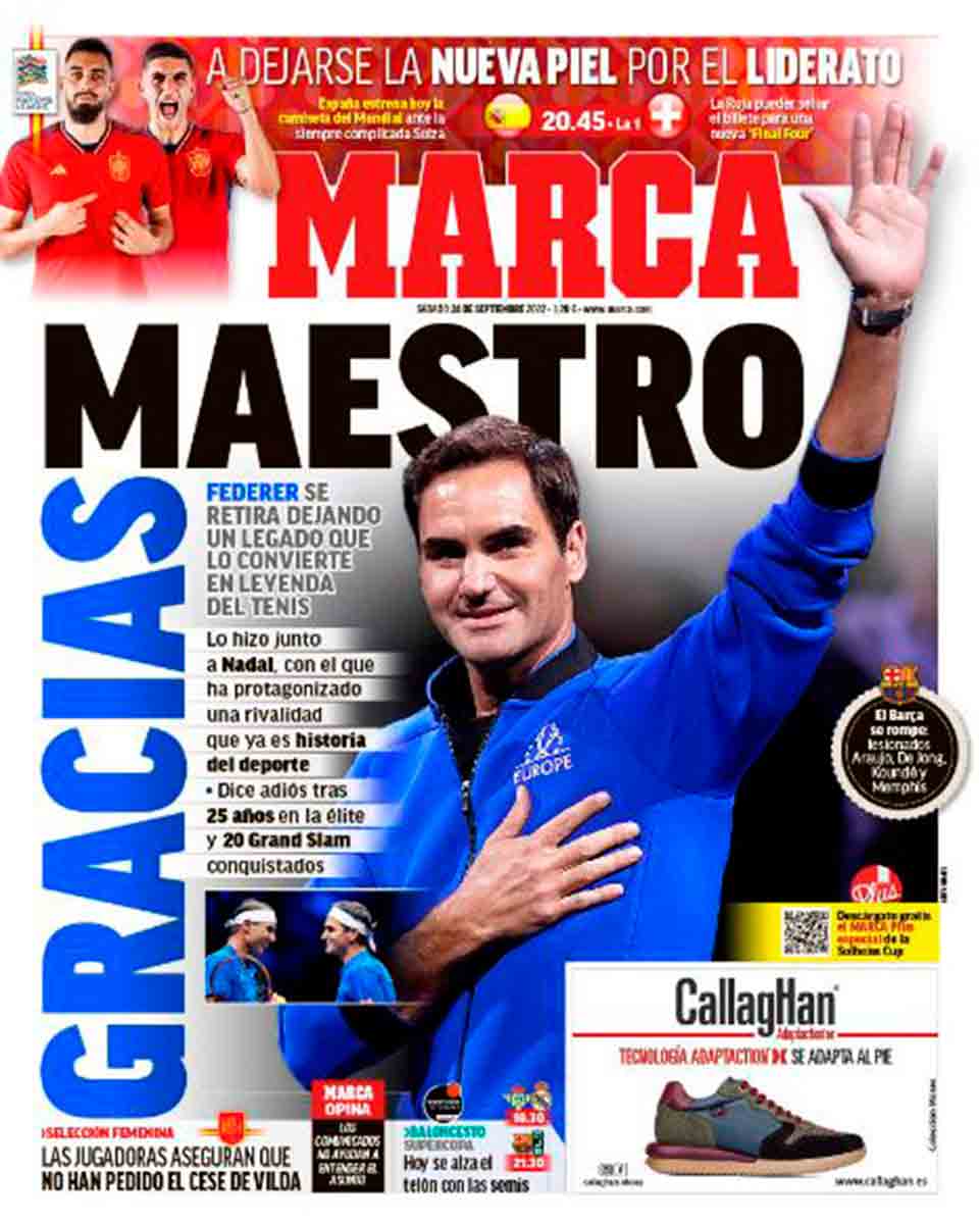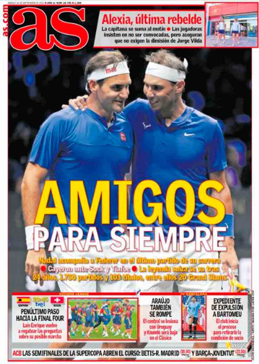 La portada de As reparte el protagonismo del suizo con nuestro Rafa Nadal, lo cual nos parece poco oportuno. Roger es el más grande y era su despedida, ese era el hecho noticiable, no la emotiva amistad que comparte con Rafa desde que ambos batallan en las pistas. Y sí, sabemos que habrá quien nos lo discuta, Roger es el más grande, entre otras cosas porque tiene 20 Grand Slams. Y aun así, Rafa tiene 22, lo que da una idea de la magnitud de su carrera, de la enormidad de todo lo conseguido por el manacorí. 14 Roland Garros tan inigualables como 14 Champions.