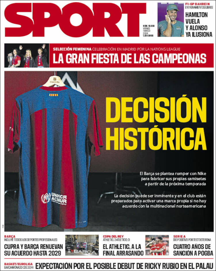 Sí, amigos, sí. "Decisión histórica". Tal vez histórica por razones completamente distintas a las que Sport trata de defender aquí, pero históricas al fin y al cabo. La historia hay que interpretarla bien. Por ejemplo, en este caso, cualquier historiador medianamente competente comprendería que Nike planea dar la espalda al patrocinio del Barça, hastiado de unir su imagen con la de un club acusado de la comisión de todos los delitos imaginables, entre ellos la corrupción continuada de la competición vía pagos a la élite arbitral española. Nike no quiere que se le relacione más con eso, lo cual nos parece completamente normal, pero el Barça actúa con la astucia del adolescente que se entera de que la novieta le va a dejar esa tarde en la disco y se adelanta a la jugada, dejándola él a ella para salvaguardar el orgullo. O al menos que parezca que es él quien deja a ella.