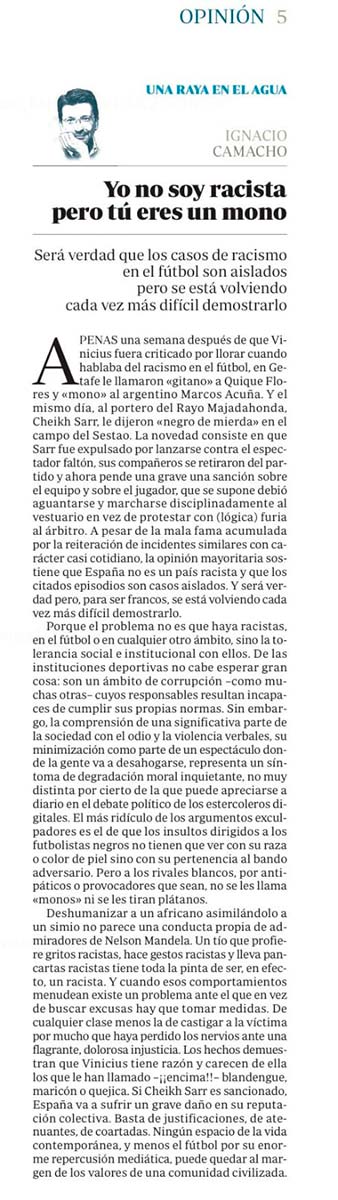 Buenos días, amigos. España está estremecida ante el espejo, preguntándose si no será que al final es racista. Para ello ha sido necesario que la ominosa mancha de xenofobia trascienda a la persona de Vinícius. Mientras el racismo pareció ensañarse exclusivamente contra el brasileño, no hubo demasiado que objetar, poniéndose el foco no tanto en los ataques de los cafres de turno cuanto en la víctima, tildado de provocador y de cosas todavía peores. Todo fue un "Algo habrá hecho" de manual, ¿recuerdan?