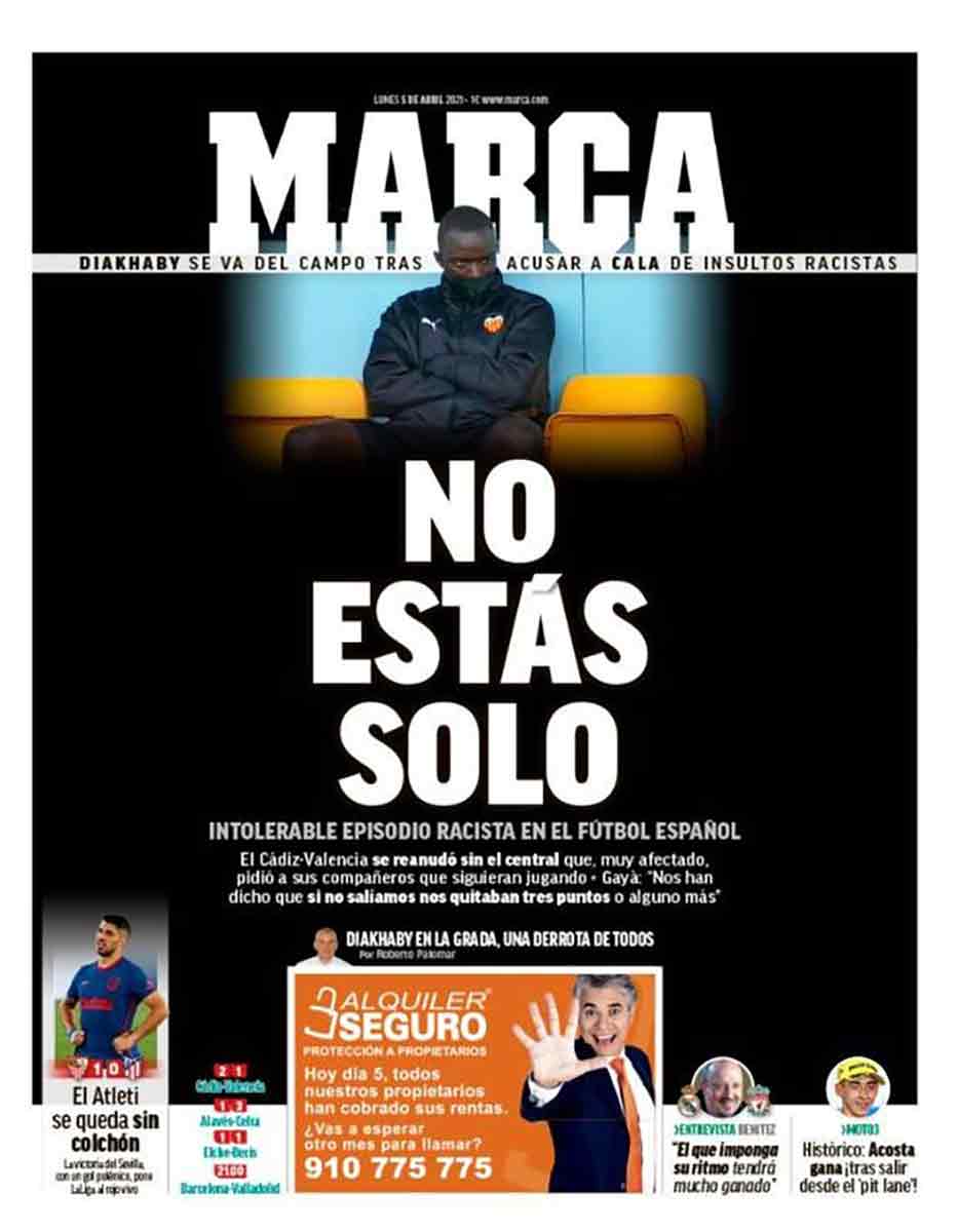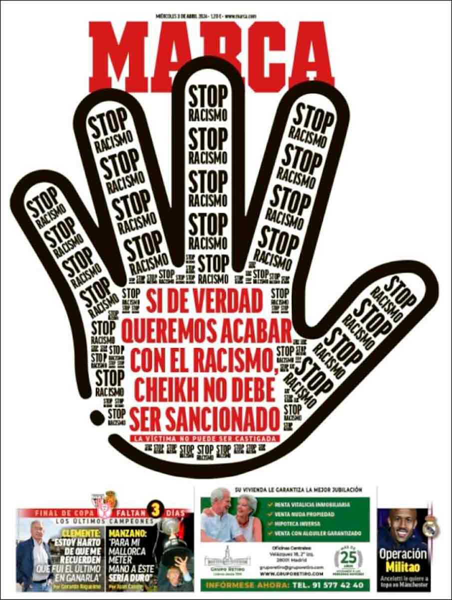 Sí, amigos. Marca se escandalizó ante unos hipotéticos (nunca se demostraron) denuestos racistas contra Diakhaby por parte de un jugador del Celta, y se vuelve a escandalizar ahora ante la posibilidad de que se sancione a Cheihk por haber reaccionado destempladamente contra el tipejo que profería insultos racistas contra él desde la grada. Ambas portadas, aun estando abiertas a matices, nos parecen bien. Lo que no nos parece bien es el sangrante contraste con la tibieza de Marca (cuidado: no es sólo Marca, sino que se trata de algo extensible a otros medios escritos y sobre todo a radios, televisiones y streamers) contra todo lo que hay entre Dhiakaby y Cheihk, o sea, contra al acoso a Vinícius, sistemáticamente minimizado en su importancia y con el foco puesto en el brasileño, como si en un orden natural de prioridades se impusiera el dejar claro lo mal que te cae Vini por encima de la lucha contra esta lacra.