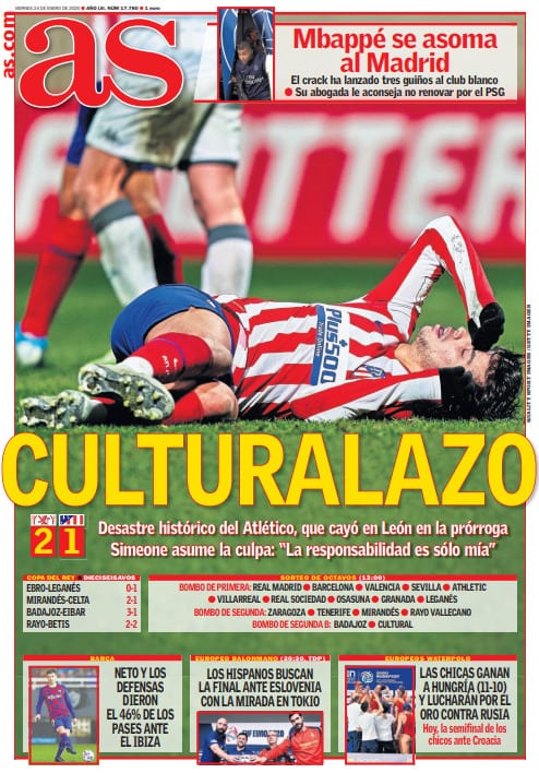 Buenos días. El Atlético de Madrid, más conocido como Aladino de Murcia, más conocido aún como Malakito de Memphis, fue ayer eliminado de la Copa del Rey por un equipo de Segunda B, la Cultural Leonesa. Ni los más viejos del lugar (siendo el lugar Madrid, Murcia, Memphis, León y todo lo que hay en medio) recuerdan un oprobio mayor que el sufrido por los del Cholo.