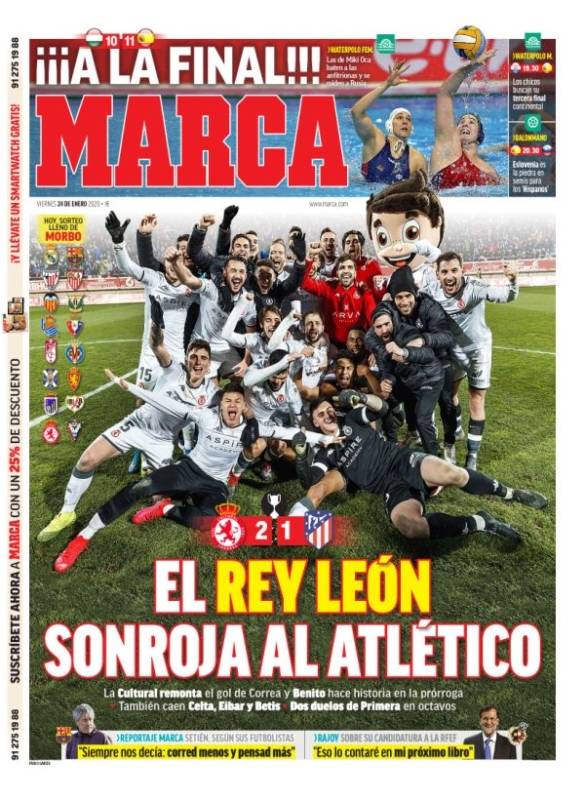 Ni rastro del Cholo. Se conoce que, en esta ocasión, Simeone había causado baja, habiendo sido reemplazado por el Mono Burgos como ensayo para la nueva andadura en solitario que ha anunciado el virtuoso rockero. Nos extraña (es un decir) que Marca no cite al Cholo ni de pasada en esta su primera página, probablemente, insistimos, porque no estaba por allí. Hemingway never ate here. Simeone nunca estuvo en León. No al menos para Marca, publicación tan presta en otras ocasiones históricas para señalar con el dedo al entrenador de turno como máximo responsable del ridículo.