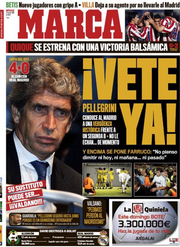 “Simeone, vete ya”. Nosotros tampoco nos lo imaginamos. Ni en la ocasión de la deshonra más homérica encuentra el Cholo criticismo por parte de la prensa. Ni en la ocasión en la cual el propio Cholo se inculpa (como hizo al término del partido, lo cual es de agradecer), toma el guante la prensa para culparle. Mira que se lo había dejado a huevo (o cigoto) el mismo técnico, pues ni por esas. La portada de As menciona al menos al Cholo, a diferencia de la de Marca, pero se limita a citar las propias palabras del argentino en su asunción de responsabilidad, en lugar de proceder a hacer lo que el Cholo está convirtiendo en poco menos que inevitable: darle la razón. Pues es verdad, Cholo: la responsabilidad es tuya.