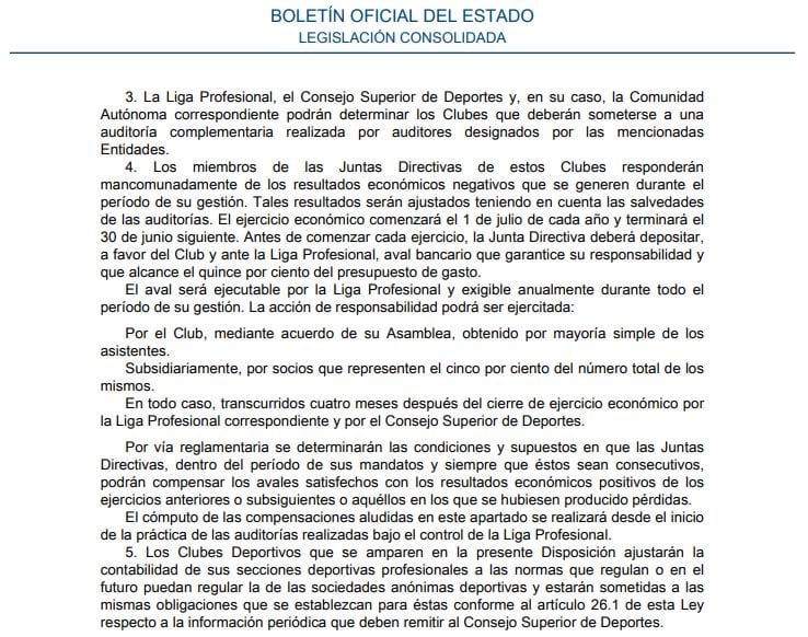 Dichos avales pueden ser ejecutados por el club, a petición de un 5% de los socios o de la propia Liga. Se establecen por vía reglamentaria los supuestos en los que se pueden compensar pérdidas. En los últimos cinco años el club ha tenido una media anual de beneficios de 33 millones € por lo que hay margen para la compensación. Todo esto puede ser papel mojado si al final se permite una excepción para cerrar las cuentas más allá del 30 de junio. No hay precedente comparable ya que la anterior vez que se jugaron partidos más allá de esa fecha fue en la temporada 88-89, un año anterior a la publicación de la Ley del Deporte.