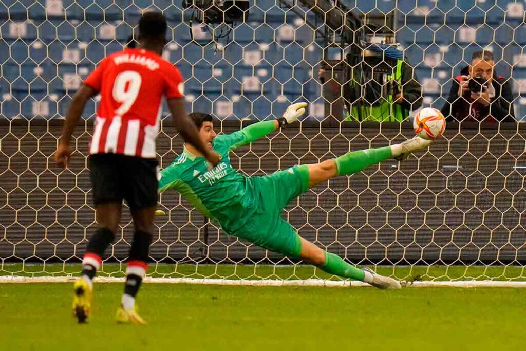 Al igual que ocurre con Benzema, Marcelo, Modric, Kroos, Carvajal o Nacho, son jugadores de perfil alto en el césped y bajo en el ego. No conocen el narcisismo, miran por el club siempre antes que por ellos, no dan un problema y sí muchos motivos para sentirse orgulloso de ellos. A las buenas personas les suele ir bien y Courtois lleva una trayectoria impecable hasta el día de hoy desde que aterrizó en Chamartín. Ni un mal gesto a la grada cuando le silbaban, que le silbaron. Ni una portada malintencionada. Ni un pulso al club ni a la prensa. Trabajo, trabajo y solo trabajo. Lleva tiempo ganando muchos puntos en Liga, solventando con grandes intervenciones malas actuaciones del equipo e incluso, en la Supercopa de España de 2020 —debe ser su torneo preferido— también detuvo un penalti a Thomas en la tanda de la final frente al Atlético. Pero ayer llegó su cénit en el Real Madrid. Solo hay que ver la felicitación de todos sus compañeros tanto después de detener la pena máxima (a Raúl García, por cierto, doble placer) como al finalizar el encuentro. Una de las mejores paradas vistas en un penalti. Courtois es el portero total y lo tenemos nosotros.