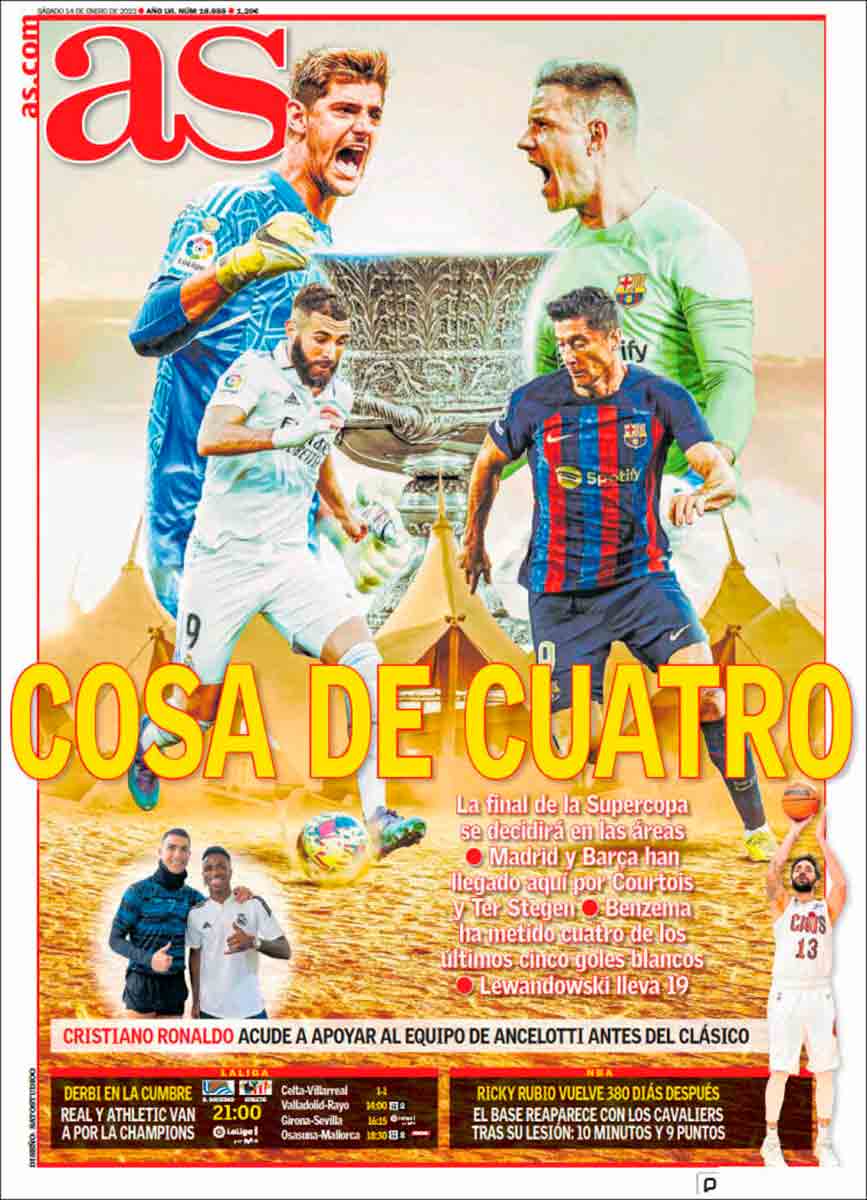 Reconózcanlo. Si alguien les hubiera dicho que un Madrid-Barça sería “cosa de cuatro”, pensarían que el titular, lo noticiable, se referiría al trío arbitral más el secuaz del VAR, máxime si los “cuatro” de mañana son el primo de Jesús Bengoechea, sus asistentes y el jubileta González González en el VAR. Pero no, el diario As limita el resultado de la final a los dos porteros (Courtois y Ter Stegen) y los delanteros centro (Benzema y Lewy).
