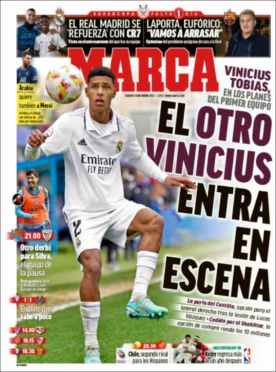 Por su lado, Marca centra la portada en el que llama “el otro Vinícius”. Tobias, quien puede ser una opción ante los problemas físicos que arrastran los habituales del puesto, Carvajal y Lucas Vázquez. La perla del Castilla tiene muy buena pinta como futbolista para la primera plantilla y parece previsible que en algún momento próximo dé el salto para cubrir la banda derecha.
