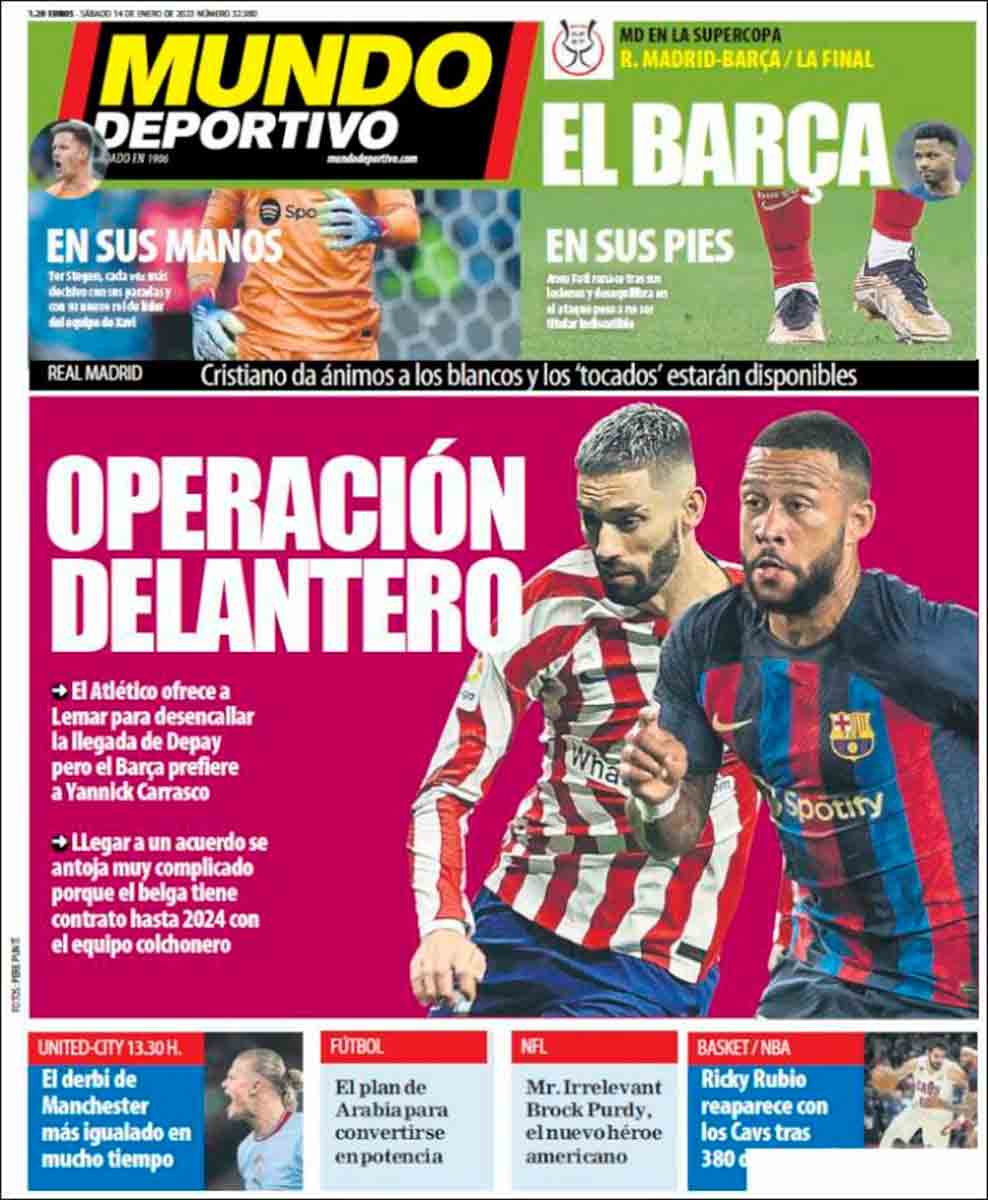 Mundo Deportivo prefiere centrarse, como el noventa por ciento de los días del año, en nuevas incorporaciones de la plantilla culé. La novedad en el Barça es que esta vez sí hablan de una salida para que haya una nueva llegada, no como ocurre de manera recurrente: el cambio de Depay por Lemar o por Carrasco, que lo mismo nos da, que nos da lo mismo.