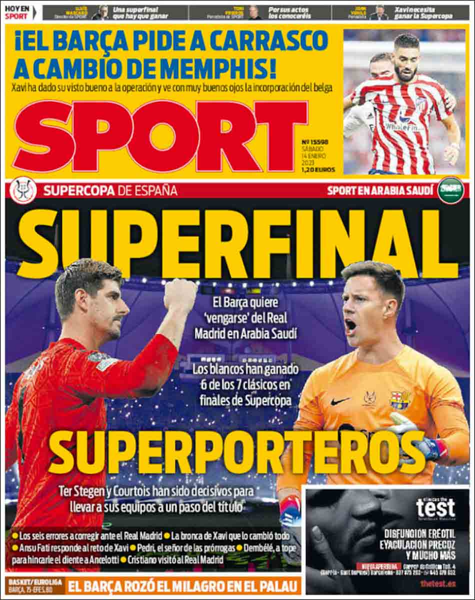 No sabemos ustedes, pero nosotros nos sentimos algo fríos, como esta mañana de invierno. Como Ancelotti embutido en una sudadera en las noches saudíes, o como los nuestros durante la mayor parte del partido frente al Valencia. Mañana tenemos un nuevo Real Madrid-Barça, la posibilidad de ganar un nuevo título y seguimos como anestesiados, ateridos, congelados. No vamos a hacer como Shakira y Piqué en su Twingo y ponernos el temazo de Barto a Messi como en la genialidad de Mr. Paquito porque debemos centrarnos en lo importante, que es el partido de mañana. Así que mejor entramos en calor dando una vuelta a las portadas del día.