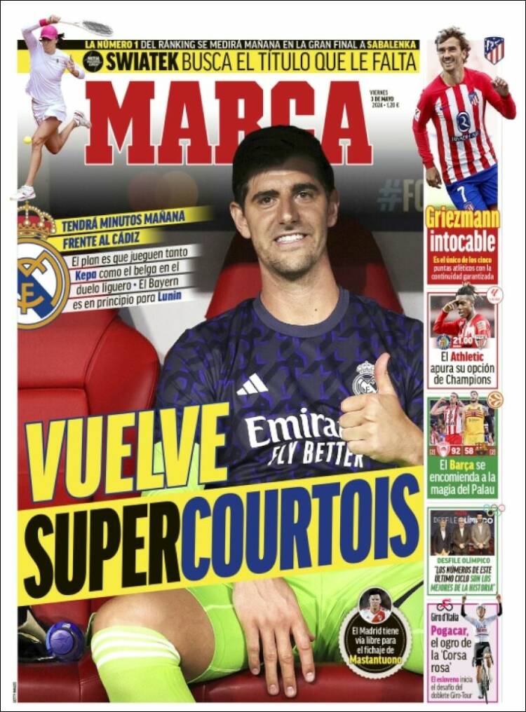 "Regresa el gigante", titula As, y en la foto le vemos despejando una bola de tenis. Como si le lanzan una de golf o una canica de las que usábamos los boomers en el recreo del cole: la va a parar. Puedes aumentar la potencia del disparo del delantero, disminuir el volumen del objeto esférico a rechazar, dilatar exponencialmente la portería. Puedes hacer lo que quieras: la va a parar. Ese es el Courtois que conocemos, y ese es el Courtois que va a volver, estamos seguros.
