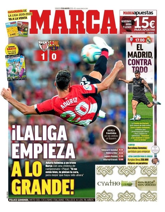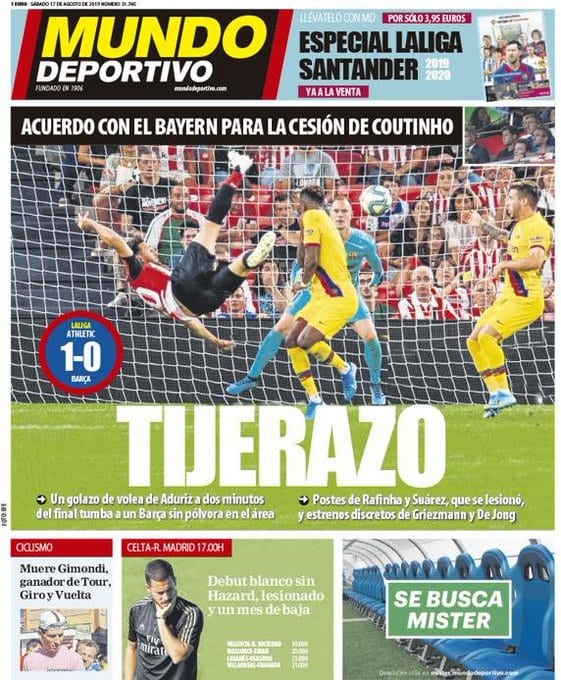Fíjense si tiene suerte el brasileño que hoy, día perfecto para hablar de su cesión al Bayern y de su desastroso paso por el Barcelona, la actualidad nos hace mirar a San Mamés, donde Aduriz evitó posibles debates con un gol antológico en el primer balón que tocó. Perdieron los culés, pero con mucho estilo y con Griezmann, De Jong y compañía en el campo.
