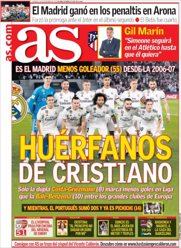 Por su parte, As y Marca tenían la oportunidad de destacar un hecho insólito en el año que ahora concluye, y es que el Madrid termina el año como campeón de Europa tanto en fútbol como en baloncesto. En su lugar, prefieren centrarse en los éxitos de los que ya no están: Cristiano y Luka Doncic. Sobre Luka ya tuvimos el articulazo de Pepe Kollins hace unos días y sobre Cristiano solo tengo que decir que sorprende el interés de todos nuestros medios este año por el Scudetto. Y por la Premier, ligas comandadas por Juventus y Liverpool, dos equipos que hace apenas seis meses eran ninguneados y rebajados por los periodistas que ahora los ensalzan para soltar siempre algún palito al Madrid. A estos 4 medios solo les deseo que el 2019 les traiga lo que se merecen.