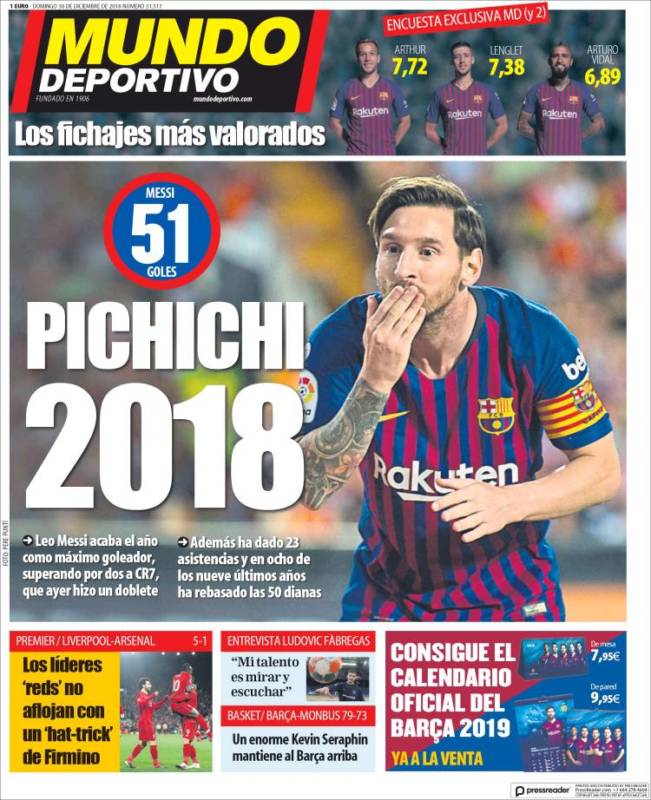Las portadas de hoy definen por sí mismas a los cuatro medios. Los dos catalanes babeando por Messi, lo cual no deja de ser normal, y me hace pensar en qué será de estos medios cuando se retire el argentino. La portada del Mundo Deportivo muestra a Messi tapándose la boca, no sé si amagando un beso o conteniendo las arcadas. La de Sport prepara un montaje (raro es cuando todo el diario no es un montaje) con Messi señalando a Ronaldo, comparando los goles de ambos y un nuevo título: "Campeón del Año". Que yo sepa, Messi no ganó el Mundial, ni la Champions, y quizás por eso el montaje se vuelve en su contra: CR7 se descojona literalmente en su cara. No en la de Leo, sino en la del Sport.