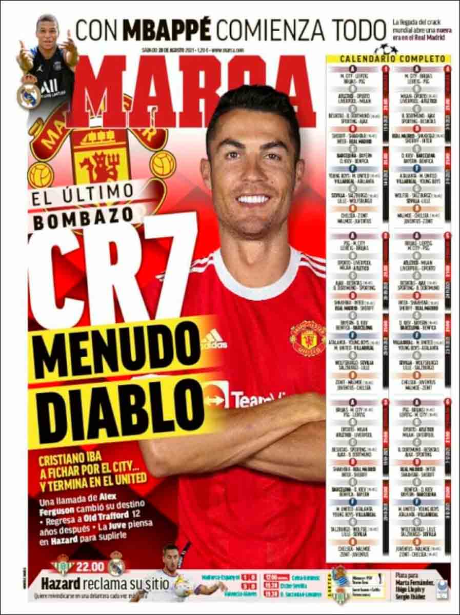 Buenos días. Faltan cuatro días (contando hoy) para que se cierre el mercado de fichajes y la cosa está que arde. Nuestro Cristiano Ronaldo -siempre será nuestro más que ningún otro- ha vuelto al lugar donde empezó a hacerse grande, el Manchester United, y es una noticia que tiene sentido desde la nostalgia, desde el amor a un club admirable de la vieja guardia europea, desde la dignidad. Nos alegramos por ello, y parece que Marca también.