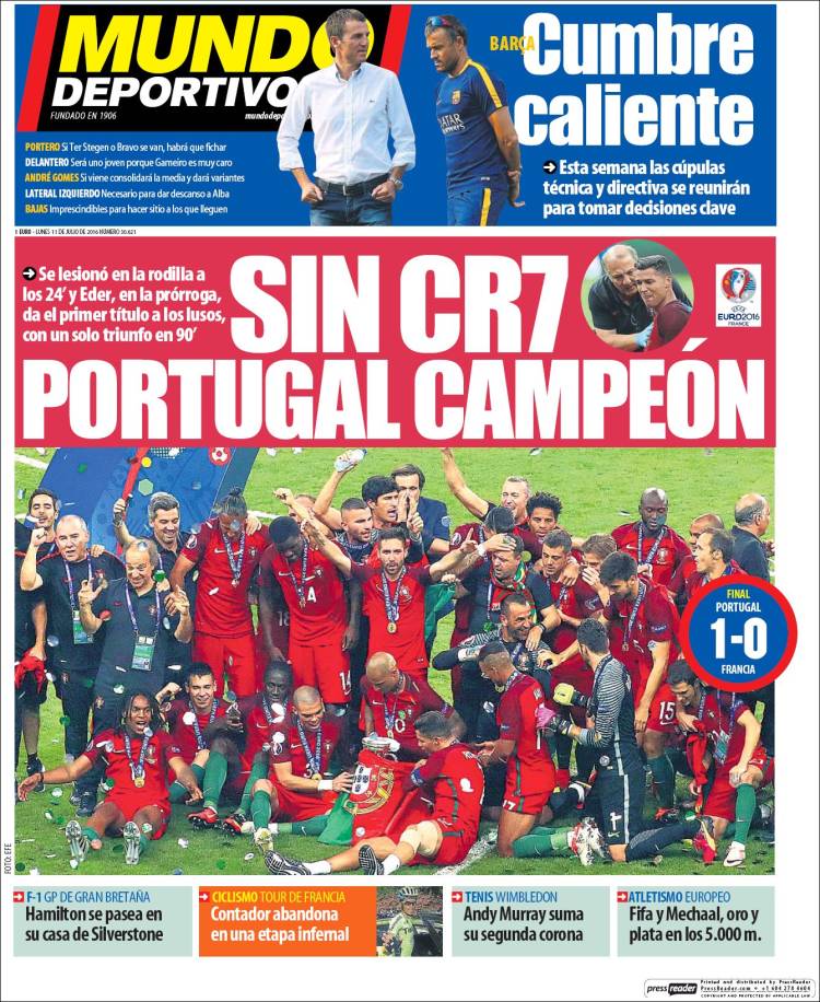"Sin CR7, Portugal campeón" y "Gloria sin Cristiano" podrían ser titulares diseñados con el fin de enfatizar el enorme mérito de los compañeros del astro portugués al haberse sobrepuesto a la tempranísima lesión de su estrella, conquistando París en una gesta sin precedentes. Algo nos hace temer, en cualquier caso, que no van por ahí los tiros.
