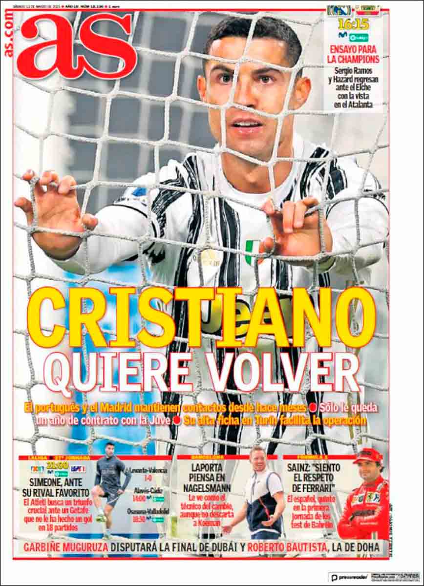 Buenos días. Cristiano quiere volver, dicen en As, y suena como el tango. Es “e” extendida que retumba triste y bonita, pero tardía. As aferrado al recuerdo nos evoca extrañas imágenes. Por ejemplo, Relaño vestido de mariachi rasgando su guitarra mientras camina por la redacción, ensayando esos acordes y acompañando a Roncero que entona: “Yo adivino el parpadeo/ de las luces que a lo lejos/ van marcando mi retorno…”, entre el ruido de las espuelas al paso y el brillo cegador de las grecas y los adornos de plata.