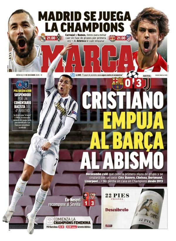Como veremos a continuación, Sport y Mundo Deportivo afrontan el papelón desde la óptica del fracaso culé, pero Marca prefiere poner el foco en Cristiano, cosa que el portugués, por supuesto, merece con creces. Como comentábamos en esta misma sección ayer, ahora que Cristiano no viste de blanco parece recabar al fin los aplausos que tanto se le escatimaron cuando defendía los colores del Madrid. Acaba de superar el registro de los 750 goles en su carrera profesional, algo imposible pero que está ahí, un récord sin parangón. De esos 750, 450 los anotó con la blanca. Sigue siendo lo más grande que han visto los ojos de quienes no vimos jugar a Di Stéfano, y es imposible dejar de quererle. Algún día volverá al club, no sabemos en condición de qué, y el mundo volverá a girar sobre su eje con normalidad, porque Cristiano Ronaldo es el Real Madrid.