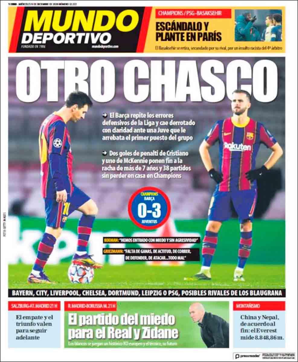 Las portadas del día le confieren un espacio sorprendentemente menor al partido de esta noche ante el Gladbach. Bien es cierto que el nuevo sopapo del Barça de Messi, esta vez ante su némesis (el inconmensurable Cristiano, a quien se echa inevitablemente de menos), es en sí mismo un argumento de primer nivel. Tanto Marca como la prensa cataculé lo convierten en el asunto principal del día, y lo cierto es que la humillación dio para ello.