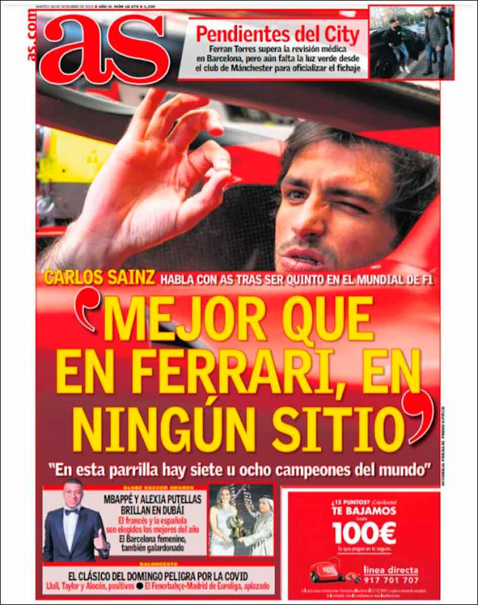 Quien sí ha visto muchas luces verdes, pese a vestir de rojo, es Carlos Sainz, a quien As dedica su portada de manera merecida: terminó quinto en el último mundial de Fórmula 1, es decir, el primer piloto de la parrilla que no conduce ni un Mercedes ni un Red Bull, inalcanzables durante todo el año para el resto.