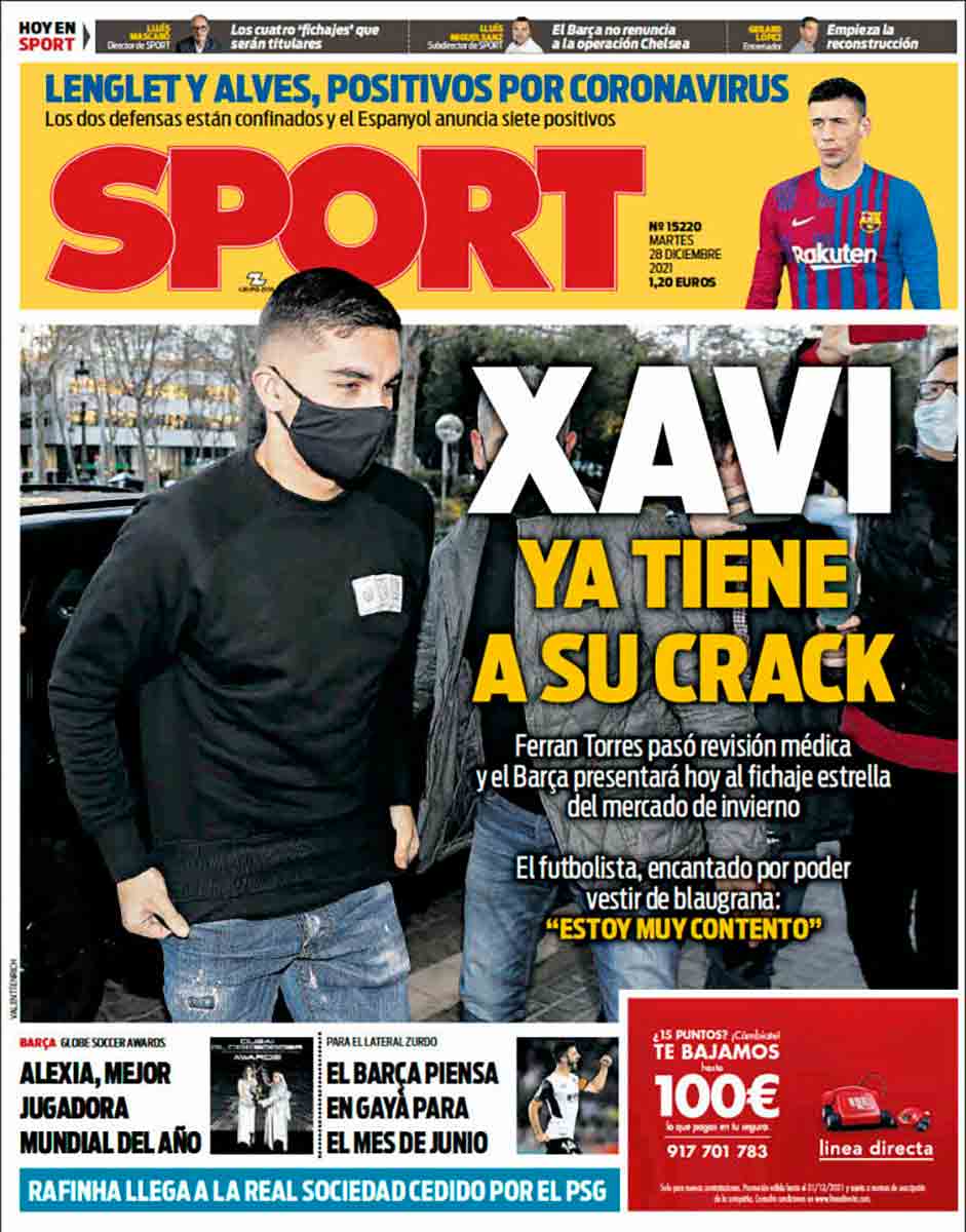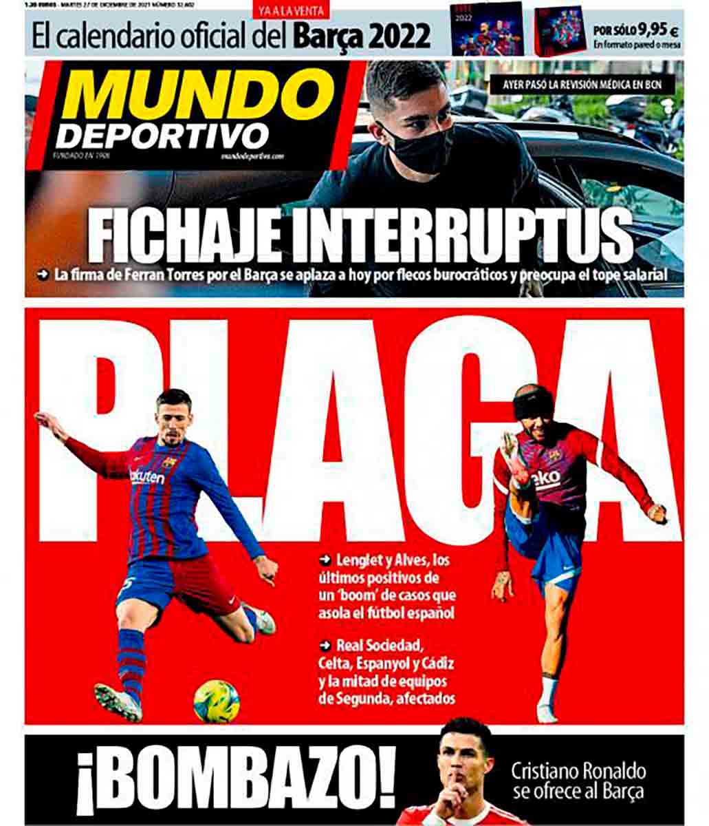 Tienen el cuajo de titular “Plaga”, ilustrado con las fotos de Lenglet y Dani Alves (que parece Paco González con la banda de los auriculares en la frente) para referirse a los positivos por covid cuando son los dos primeros casos del club catalán desde que los dinosaurios dominaban la Tierra. Como hemos dicho antes, peor sería que el titular pretendiera mofarse del resto de equipos que llevan meses informando puntualmente de cada positivo detectado.
