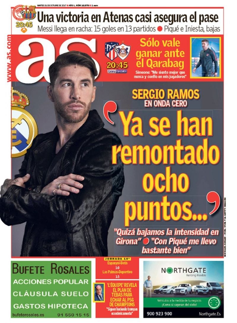 Ya en Madrid, Sergio Ramos apareció anoche en 'Onda Cero' para ejercer de capitán. Sabe que la situación no es precisamente idílica, pero quiso cerrar filas en torno a sus compañeros, su cuerpo técnico y su club. Confía en que se puedan remontar los ochos puntos de desventaja y que la temporada acabe con el equipo en Cibeles.