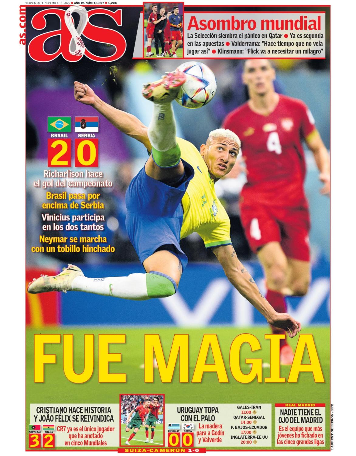 El resto de portadas del día oscilan entre la exhibición de Richarlison con Brasil, asistido por Vini (estos dos sí harían buena dupla en el fútbol de clubes blancos), hasta la sobredosis de glucosa con terminaciones en i latina que nos trae la apropiación cataculé de la goleada de la llamada roja ante Costa Rica.