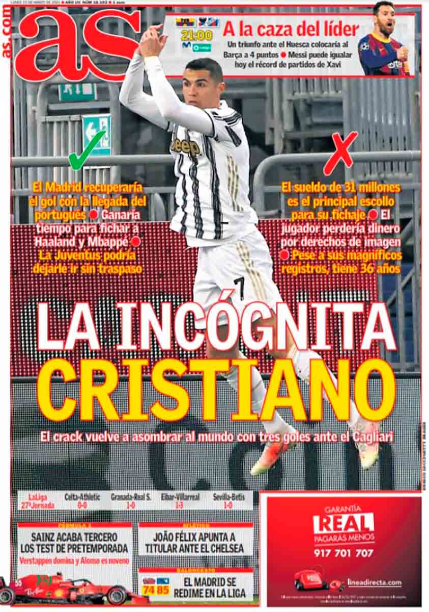 Portada del As a Cristiano por un hat trick al Cagliari????....