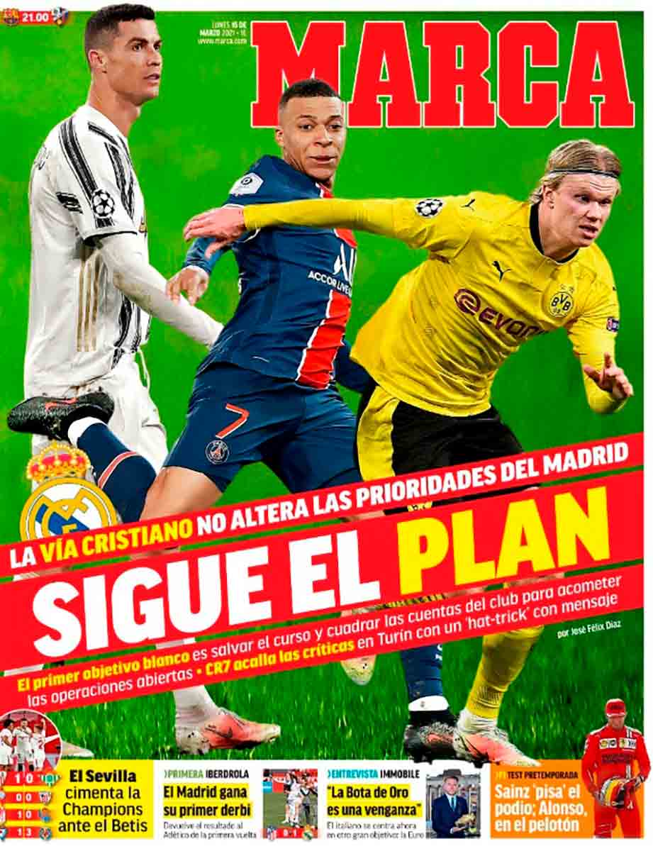 Marca nos lo pone en el mismo plano que Mbappé y Haaland, en composición que parece remitir a la clásica representación de la evolución del homo sapiens desde que fue primate hasta que caminó erguido, con la particularidad de que aquí Haaland es el último y es precisamente el que menos erguido va. Se ha agachado para la foto, consciente de que los compañeros que tiene a su espalda no calzan su portentosa estatura. “La via Cristiano no altera los planes del Madrid”, dice Marca sonando algo críptico. ¿En qué punto está la “vía Cristiano”? Tenemos claro que el jugador, vía Mendes, está como loco por volver, aunque no sabemos si estaría dispuesto a apretarse el cinturón financiero como el Madrid le exigiría. Sabemos que la Juve está también loca por la música, con la necesidad imperiosa de liberar la ficha del portugués en la esperanza de que el nivel del agua baje de la altura del cuello. Pero ¿y el Madrid? ¿Le interesa al Madrid la operación?