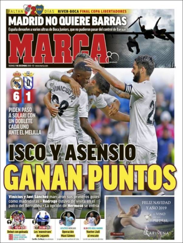 Buenos días. El Madrid, en efecto, y como dicen las portadas, goleó al modesto Melilla con reivindicación goleadora de Isco y Asensio, pero no vayáis a disfrutar de ello porque Cristóbal Soria no ha dado su permiso en Twitter. Antes bien, se ha mofado de que el Madrid le haya metido 6 al “todopoderoso” Melilla y, aprovechando que el Guadalquivir pasa con Sevilla, se ha burlado también de Vinicius a cuenta de un fallido intento de sombrero por parte del brasileño.