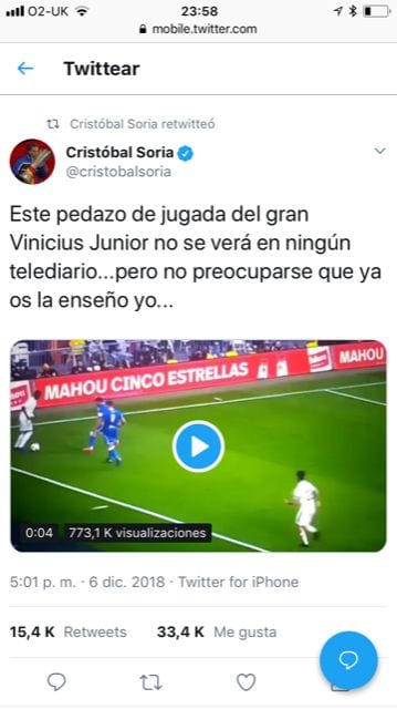 El madridismo está consternado. Lo tenemos bien merecido por precipitarnos: nunca deberíamos disfrutar por nada sin antes haber obtenido la autorización para hacerlo por parte de Cristóbal Soria. Luego pasa lo que pasa: que te ilusionas en vano y más dura es la caída después, cuando Soria dice que de eso nada con esa guasa que no se puede aguantar. A Soria le hacen mucha gracia sus propios tuits, tanto que acostumbra a autorretuitearse, a veces al instante. Cristobítal el redundante.