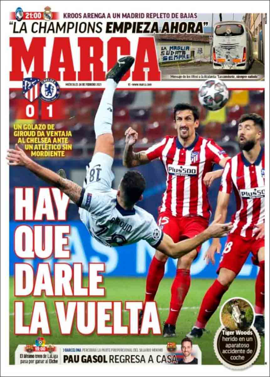 Buenos días. Duro golpe al cholismo en la noche de ayer. El Chelsea ganó el partido de ida ante el Atleti por 0-1 gracias a un gol inconmensurable de Giraud. Pese a la tradicional condición de aliado de lo rojiblanco por parte de la prensa patria, nadie osa discutir la legalidad del gol, aunque el concurso del VAR fuera necesario para su señalamiento: Giraud estaba en fuera de juego, pero el balón venía de un intento de jugarlo por parte de Hermoso, lo que habilitaba su posición para ensayar una chilena mayestática que Marca trae a su portada en una gran foto, acompañada de un titular que a su lado desempeña un papel más o menos ingenioso.