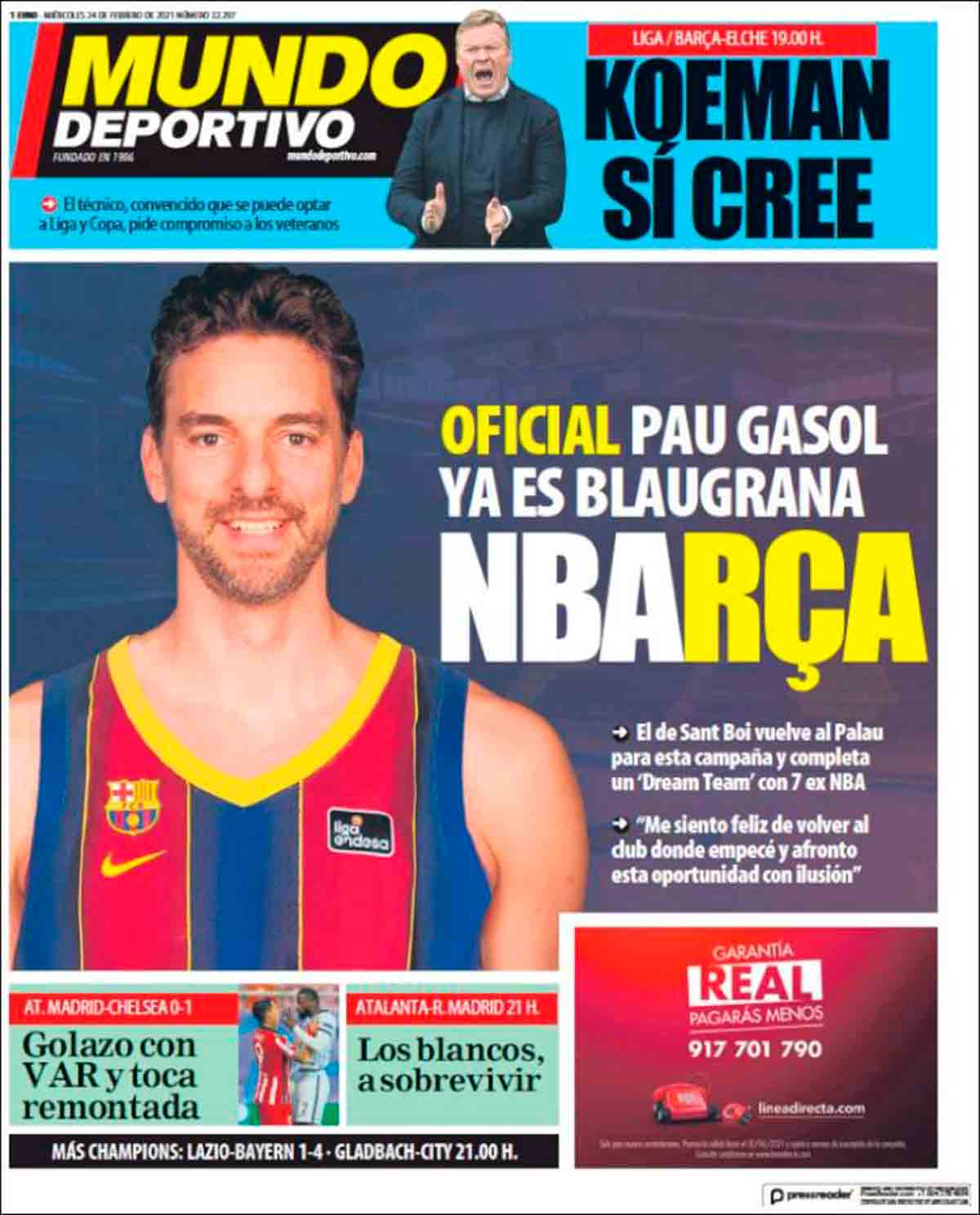Mundo Deportivo insiste en el fichaje de Gasol. Felicitamos al Barça por este buen golpe en términos marketinianos, ejecutado además a coste cero según parece. Las ejecuciones a coste cero son las únicas que están al alcance del FC Barcelona en la actualidad. NBARÇA, titula el rotativo, en alusión a los 7 exNBA que junta su plantilla en este momento. No cabe sino dar la enhorabuena a la entidad por contar con tanta estrella en su sección de baloncesto, y sobre todo por contar con esa pléyade de gigantes sin pagarles. Se trata de un verdadero hito que sin duda se estudiará en Harvard, una lección arriba o abajo de la que muestra al mundo cómo encadenar cinco humillaciones europeas en cinco años consecutivos en la sección de fútbol.