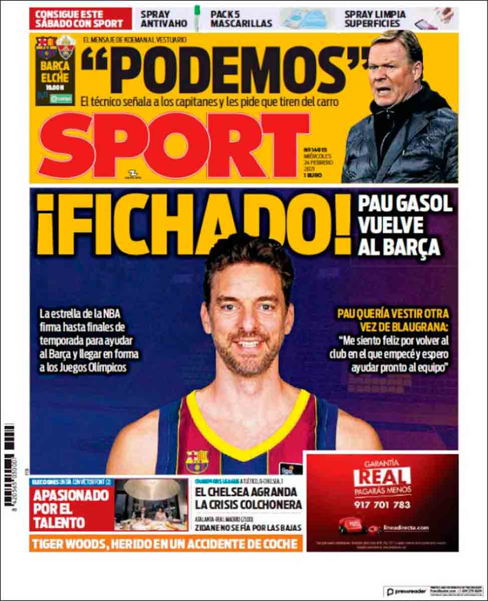 La sorpresa del día la trae Sport. No por el fichaje de Gasol por el Barça, tan chapucerísimamente anunciado ya en una serie de anuncios y desmentidos que deberían haber actualizado la vigencia del denostado coitus interruptus como medio de control de la natalidad. No. La sorpresa del día la da Koeman, que se confiesa podemita. A veces escuchamos a Pablo Iglesias hablar de deficits democráticos y lo cierto es que nos cuesta entenderle, que es lo que nos pasa con Koeman cuando anuncia que “podemos” (¿o tal vez es solo Sport parafraseándole?). Perdón pero ¿a qué se refieren? ¿Que pueden ustedes qué exactamente? ¿Pueden ganar la Liga (hmmmh...)? ¿Remontar al PSG, remontar al Sevilla (hmmmmh...)? No hay pistas en la portada de Sport, salvo un llamamiento a los capitanes para que “tiren del carro”.’ Un mensaje ciertamente anticasta que refrenda, por sorpresivo que sea, el anuncio de corte político del holandés.