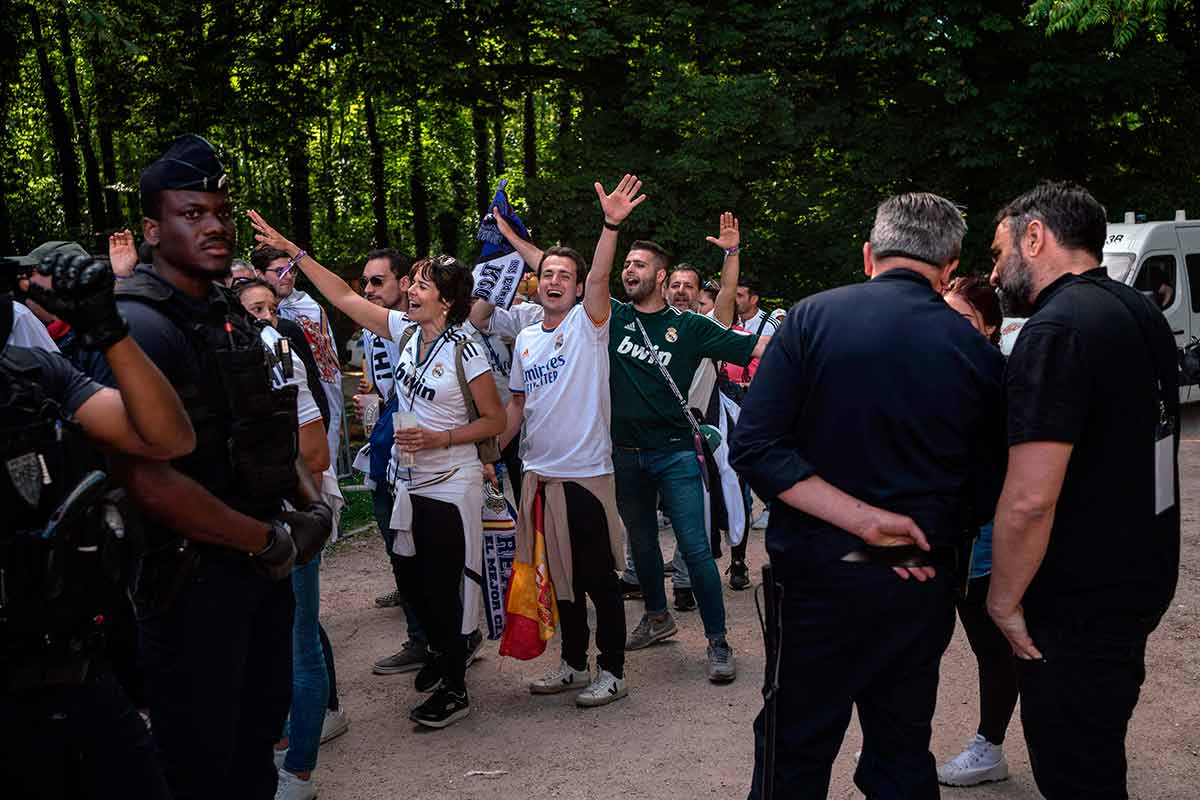 Beaucoup de saleté partout, des tonnes de verres cassés par terre et à côté des arbres, et quand je suis arrivé, il y avait moins de supporters madrilènes que de jeunes Français du quartier. Tous ceux d'entre nous qui sommes allés ensemble nous avons mis nos sacs à dos sur notre poitrine, et non plus sur notre dos, et nous avons protégé nos portefeuilles et nos téléphones portables. Les téléphones portables étaient l'atout le plus précieux pour les voleurs potentiels, car la plupart des tickets pour accéder au terrain étaient numériques et les téléphones portables étaient donc essentiels pour les activer.