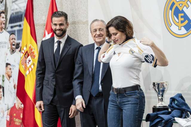 10:53. Entrega de trofeos y presentes entre Florentino y Ayuso. Esta última se pone la camiseta. Ahora entendemos el atuendo informal: con los vaqueros la camiseta sienta muy bien. Al menos a ella. A Rocha no le quedaría igual.