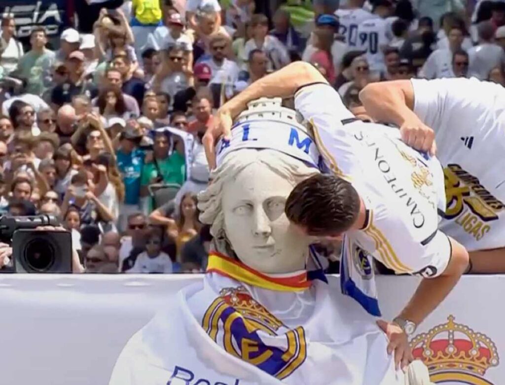13:18. Llega el autobús a Cibeles. Es como una busiana pero sin tener que hacer los deberes después. Los jugadores capturan en sus móviles la marea humana. Van en cubierta, con las gafas de sol puestas para protegerse del sol y del éxito. El sol restalla en las caras, la calzada y las marquesinas de los autobuses, a las que se encarama la marabunta. Suena el himno y la multitud lo corea. Nacho porta la copa. Los jugadores desfilan por la pasarela que conduce a la diosa. Todos están exultantes. Carvajal. Rodrygo. Brahim. Jude. Valverde. Lunin. Militao y Rüdiger con sus bailes espasmódicos. Mendy. Ceballos. Fran. Camavinga. Alaba, a quien ya sin blandir una silla parece que le falta algo. Kepa, cuya aciaga estancia en el equipo no parece ensombrecer sus ganas de celebrar. Qué acojonante colección de triunfadores no contaminados por el nocivo virus de la vanidad.